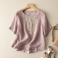 春夏新款重工刺繡棉麻上衣女2025文藝復古寬鬆高級感短袖棉麻T恤