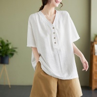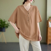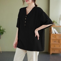 2025新款春夏季冰絲亞麻 大尺碼女装V領短袖襯衫上衣 寬鬆T卹 胖MM顯瘦